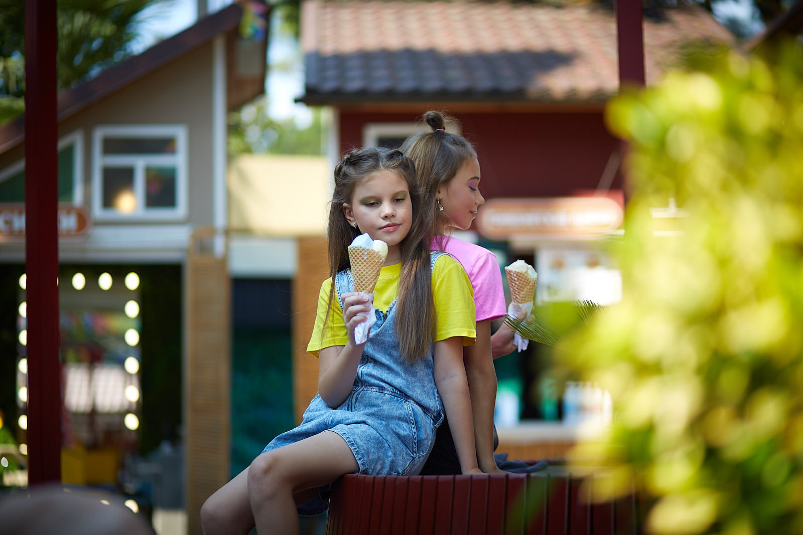 Фотосессия в парке: дети едят мороженое